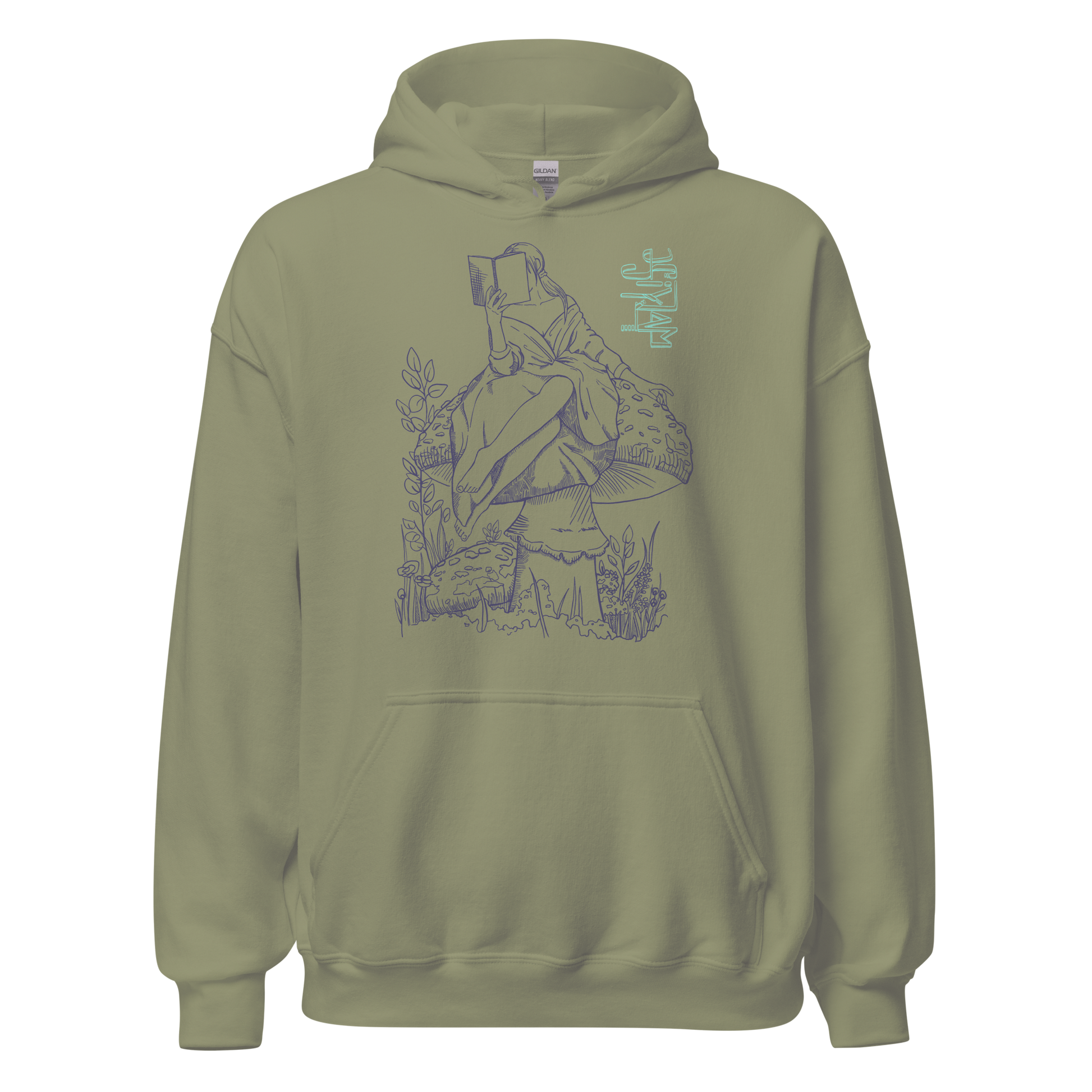 This enchanting hoodie features a beautifully detailed illustration of a woman in an elegant dress, sitting atop a mushroom, engrossed in a book. The design is a celebration of whimsy, elegance, and the joy of reading, making it a standout piece for any book lover or fan of unique fashion.